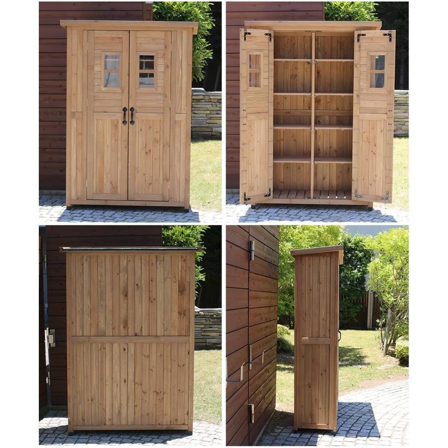 木製物置 北欧風 屋外 大型収納庫 天然木 用具入れ 仕切り棚 両扉 レトロ 庭 大きい 整理 カントリー エクステリア 駐車場回り ガレージグッズ ガーデン用品屋さん